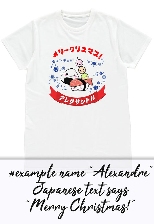 Custom Japanese T Shirt Kawaii Sushi Christmas Calligraphy Your Name Anime Manga Personalised Message Holiday Xmas Cute Women's Men's Tee