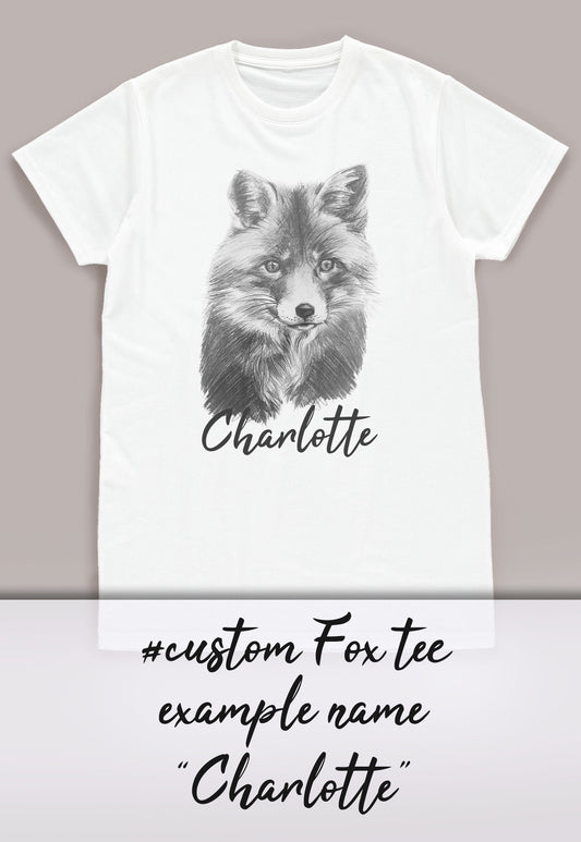 Custom Name Fox T Shirt Personalised Your Message Artist Pencil Sketch Drawing Cub Vegan Animal Cute Forest Nature Men's Women's Printed Tee