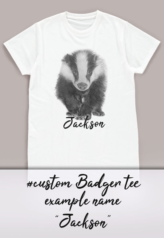 Custom Name Badger T Shirt Personalised Your Message Artist Pencil Sketch Drawing Vegan Animal Cute Forest Nature Men's Women's Printed Tee