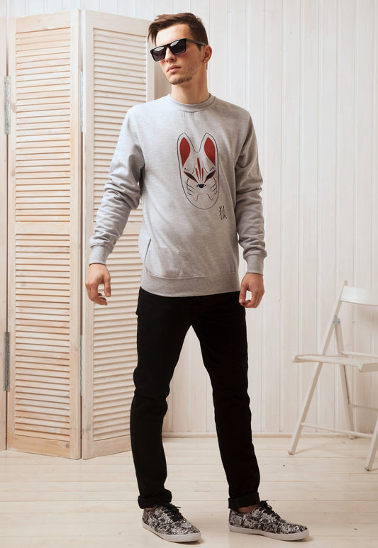 Japanese Sweatshirt – Kitsune Fox Mask – Kitsunemen Calligraphy Kanji Inari Japan Anime Manga Kawaii Graphic Printed Pullover Sweater Jumper