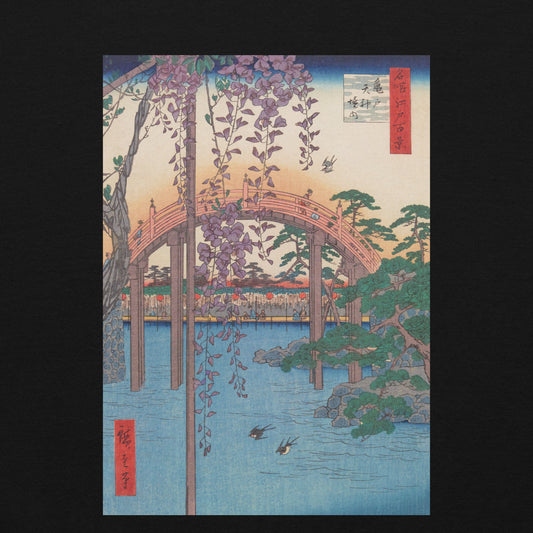Japanese Ukiyo-e Art Woodblock Print T Shirt Mens Womens Hiroshige Kameido Shrine Wisteria Bridge Monet Landscape Flowers Japan Calligraphy