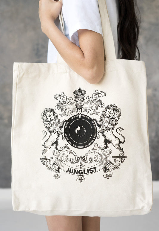 Junglist Coat Of Arms Canvas Tote - Crest Drum and Bass DJ & DnB Music Festival Print Cotton Shopper Bag Screen Printed Eco Friendly Market