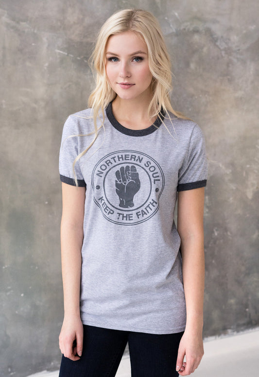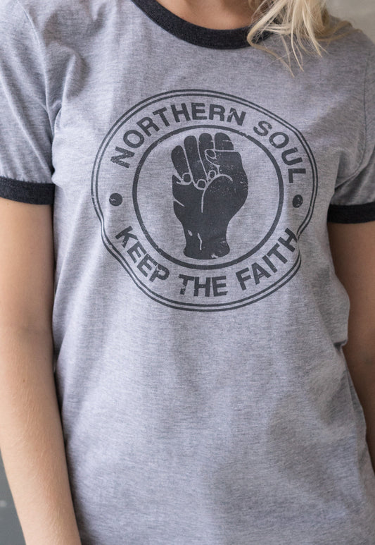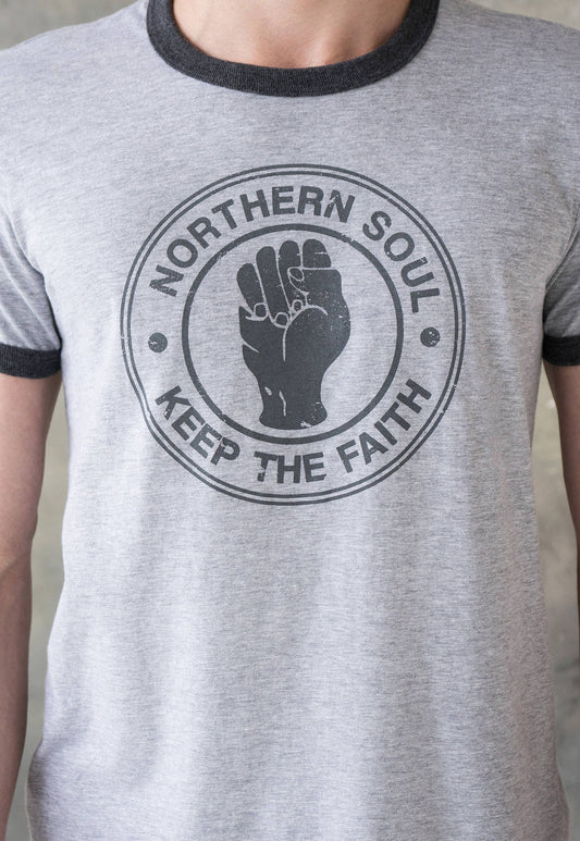 Northern Soul Ringer T Shirt Keep The Faith Fist Hand Logo Distressed Retro Mod Mods Soul Music 60s 70s 80s Vintage Womens Mens Printed Tee