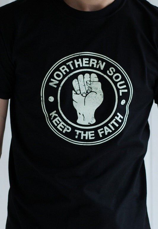Northern Soul T Shirt Keep The Faith Fist Logo Distressed Retro Mod Mods Soul 60s 70s Vintage Style Mens Womens Graphic Printed Tee T-Shirt