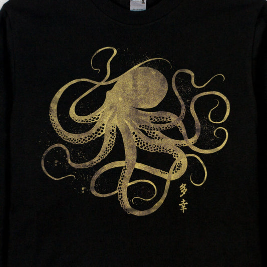 Octopus Japanese Long Sleeve Print T Shirt Gyotaku Traditional Art Anime Manga Gold Print Tattoo Kanji Calligraphy Printed Mens Women Tee