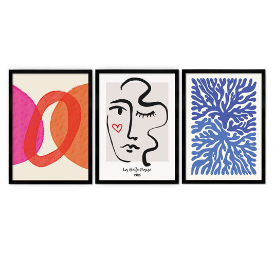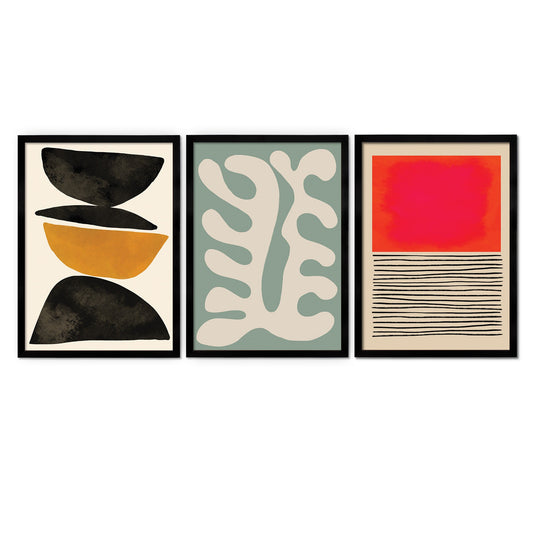 Set of 3 Three Abstract Art Print Posters Framed Frame Wall Home Decor Modern Contemporary Handdrawn Shapes Colorful Minimal Mid-century