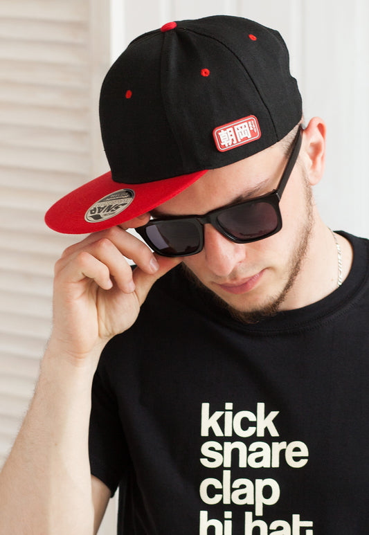 Snapback Baseball Cap with Japanese Applique – Black with Contrast Red Peak
