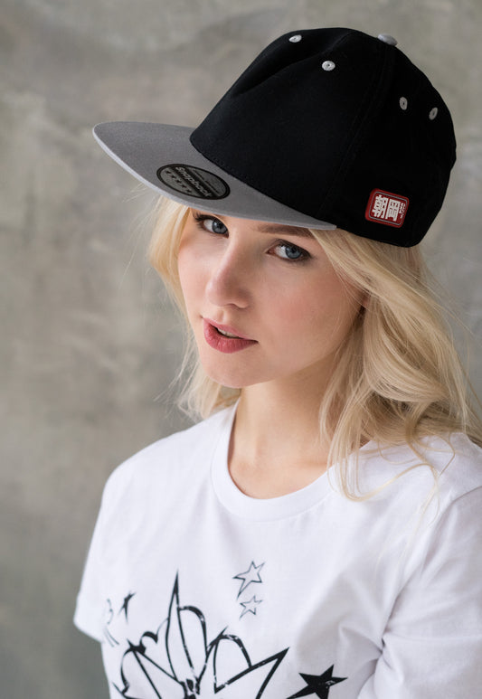 Snapback Baseball Cap with Japanese Applique – Black with Contrast Peak