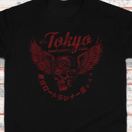 Tokyo Roadrunner Tribe T-Shirt – Japanese Winged Biker Skull Design (Unisex)