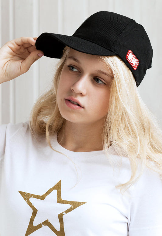 Snapback Baseball Cap with Japanese Applique – Black with Contrast Red Peak