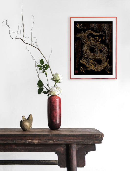 Japanese Dragon Art Print Poster Woodblock Ukiyo-e Style Wall Art Samurai Tattoo Kanji Beautiful Japan Calligraphy Martial Arts Bushido A3