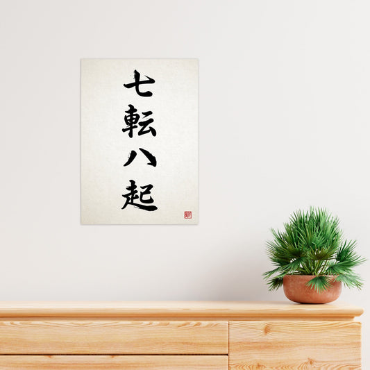 Japanese Calligraphy Nanakorobi Yaoki Wall Art Print Poster Woodblock Ukiyo-e Zen Inspirational Quote Shichiten Hakki Tattoo Kanji A2 A3