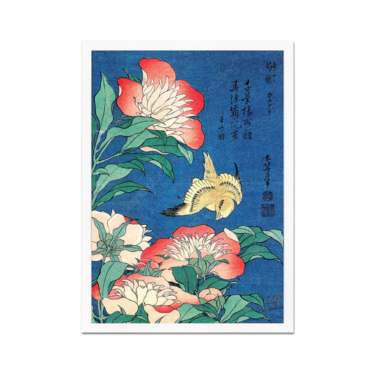 Japanese Art Print Poster Woodblock Ukiyo-e Framed Mounted Wall Hokusai Flower Floral Peonies Canary Bird Tattoo Beautiful Calligraphy A2