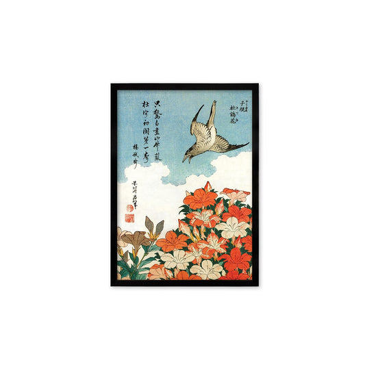 Japanese Art Framed Mounted Ukiyo-e Wall Decor Print Poster Woodblock Hokusai Flower Floral Azalea Cuckoo Bird Calligraphy Beautiful Haiku