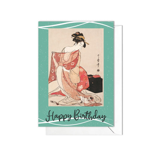 Happy Birthday Japanese Ukiyo-e Art Greeting Card Woodblock Print Aesthetic Kitagawa Utamaro Geisha Maiko Cat Neko Cute Kimono Pretty - T99