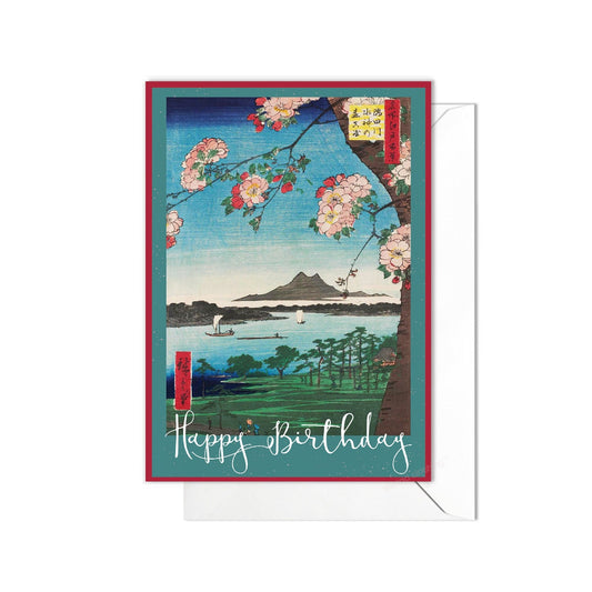 Happy Birthday Japanese Ukiyo-e Art Greeting Card Woodblock Print Hiroshige Sakura Cherry Blossoms Flowers Fuji Beautiful Calligraphy - S01