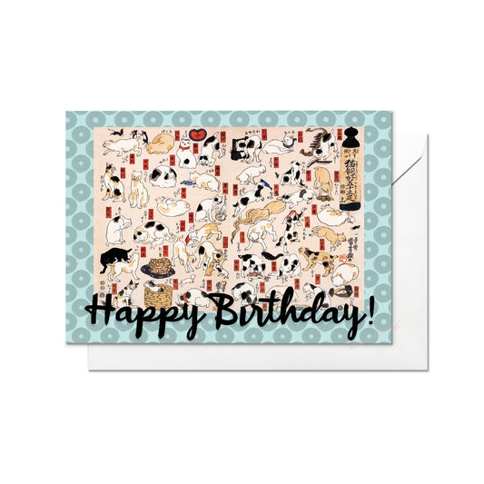 Happy Birthday Japanese Ukiyo-e Art Greeting Card Woodblock Print Aesthetic Utagawa Kuniyoshi Cats Tokaido Kawaii Cute Funny Neko - C45