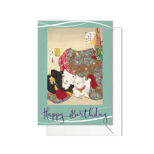 Happy Birthday Japanese Ukiyo-e Art Greeting Card Woodblock Print Aesthetic Yoshitoshi Geisha Maiko Cat Neko Kimono Beautiful Japan - G76