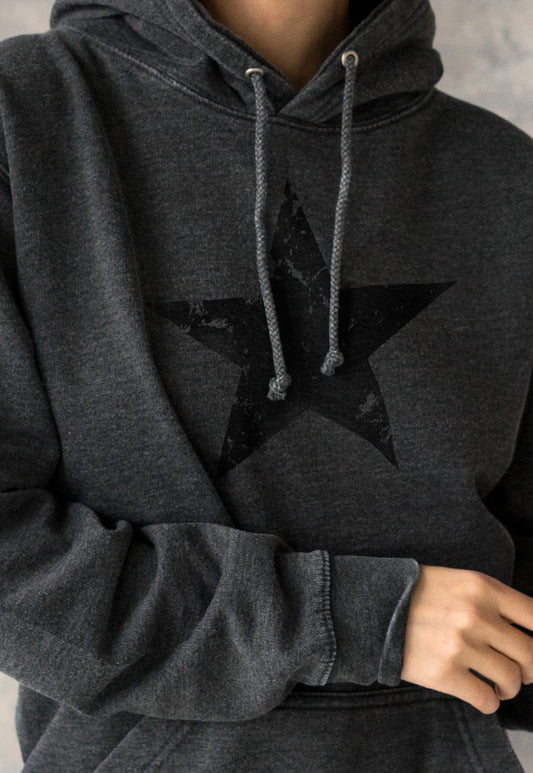 Black Distressed Star Hoodie Minimalist Abstract Geometric Streetwear Retro Graphic Design Womens Mens Sweatshirt Washed Brushed Hooded Top