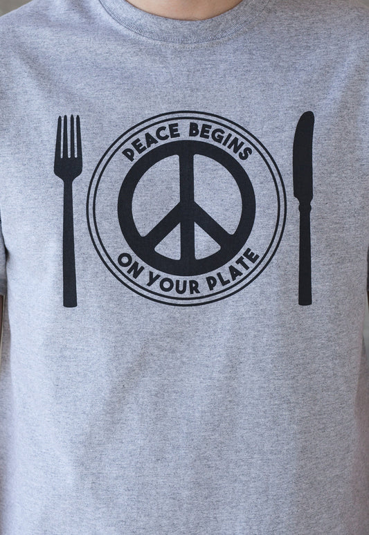 Vegan T Shirt Peace Begins On Your Plate Vegetarian Veggie Liberation Animal Rights Compassion Herbivore Peace Sign Mens Women's Printed Tee