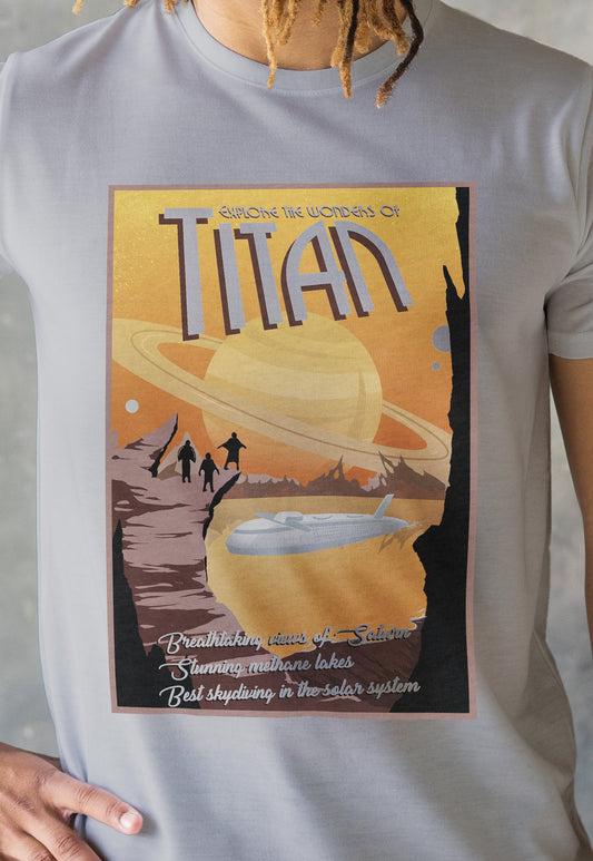 Visit Titan T Shirt Retro Travel Poster Hard Science Sci Fi Geek Geeky Astronomy Mars Saturn Mission Cosmos Space Men's Unisex Printed Tee