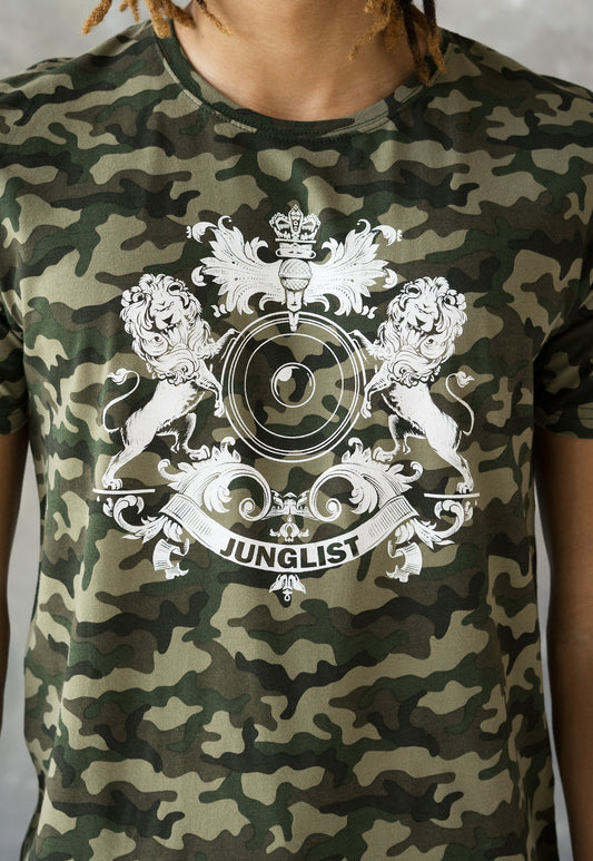 Junglist Coat Of Arms T Shirt Jungle Massive Crest Drum and Bass DJ & Synth Music Producer Festival Camo Camouflage Graphic Printed Tee