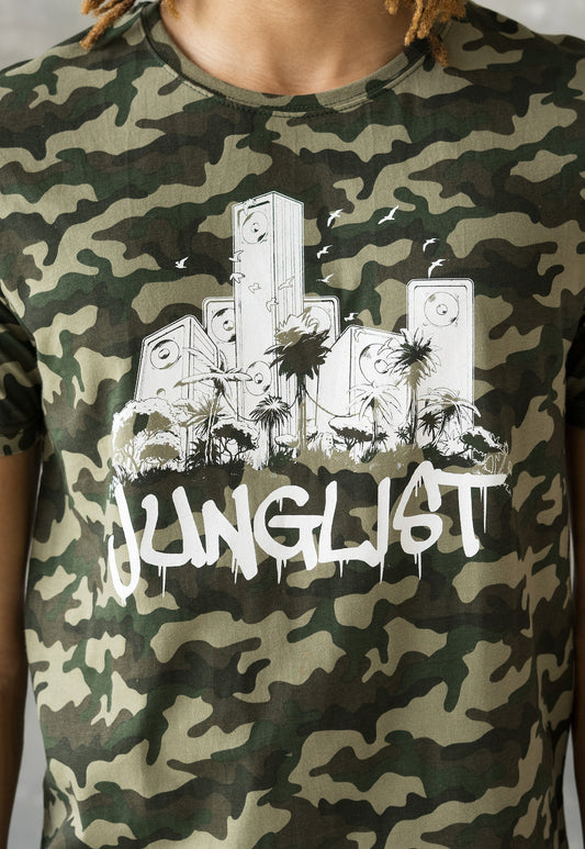 Junglist Sound System T Shirt - Jungle Massive Drum and Bass DJ & Synth Music Producer Amen Camo Camouflage Graphic Printed Mens Womens Tee
