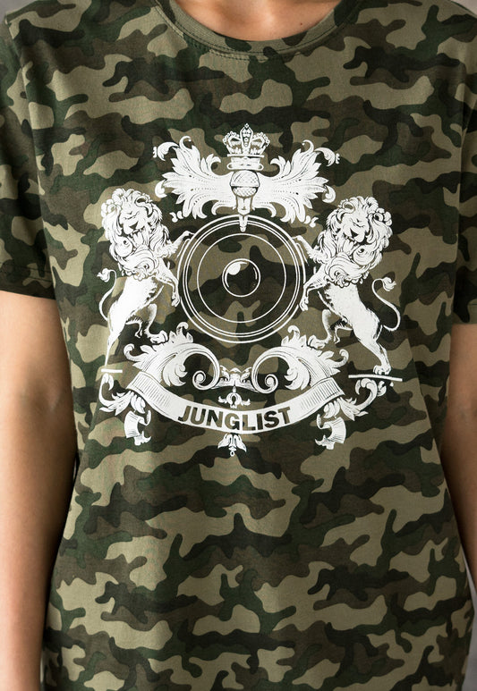Junglist Coat Of Arms T Shirt Jungle Massive Crest Drum and Bass DJ & Synth Music Festival Camo Camouflage Graphic Women's Printed Tee