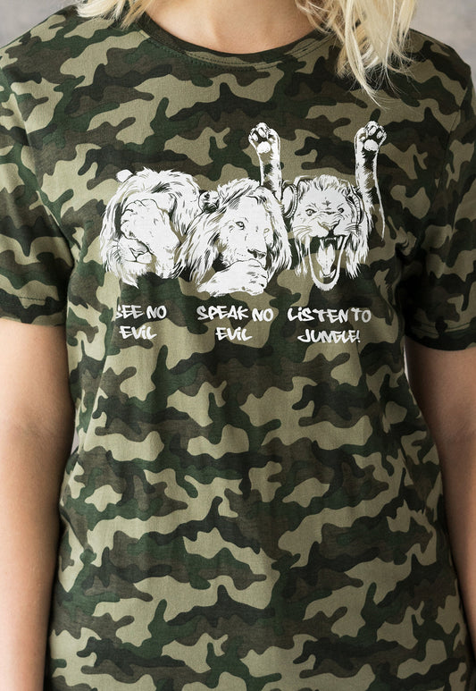 Junglist Lions T Shirt Jungle Massive Drum and Bass Female DJ & Synth Music Amen Slogan Camo Camouflage Women's Mens Graphic Printed Tee