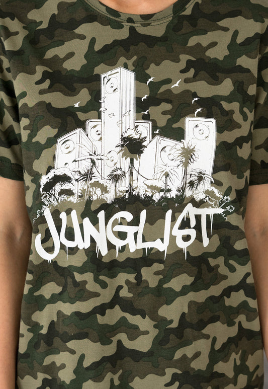Junglist Sound System T Shirt Jungle Massive Drum and Bass DJ & Synth Music Producer Amen Camo Camouflage Graphic Womens Printed Tee Top