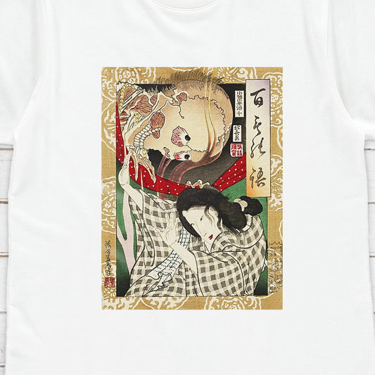Japanese Ukiyo-e T Shirt Woodblock Art Utagawa Yoshiiku Skeleton Skull Yokai Ghost Monster Horror Japan Calligraphy Womens Mens Printed Tee