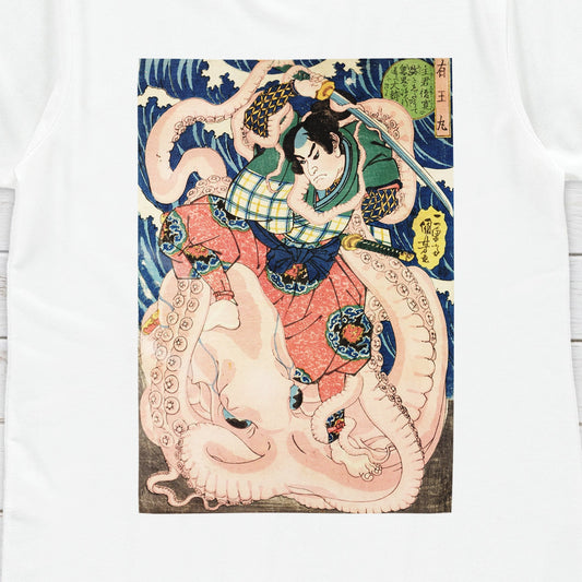 Japanese Ukiyo-e T Shirt Woodblock Art Utagawa Kuniyoshi Samurai Octopus Japan Traditional Kanji Calligraphy Womens Mens Graphic Printed Tee