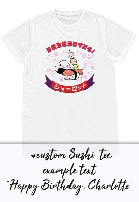 Custom Japanese T Shirt Kawaii Sushi Party - Birthday Graduation Calligraphy Anime Manga Personalised Name Message Cute Women's Men's Tee