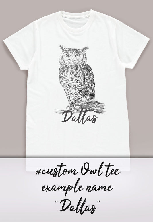 Custom Name Owl T Shirt Personalized Your Text Artist Pencil Sketch Drawing Art Bird Vegan Animal Cute Pretty Nature Mens Womens Printed Tee