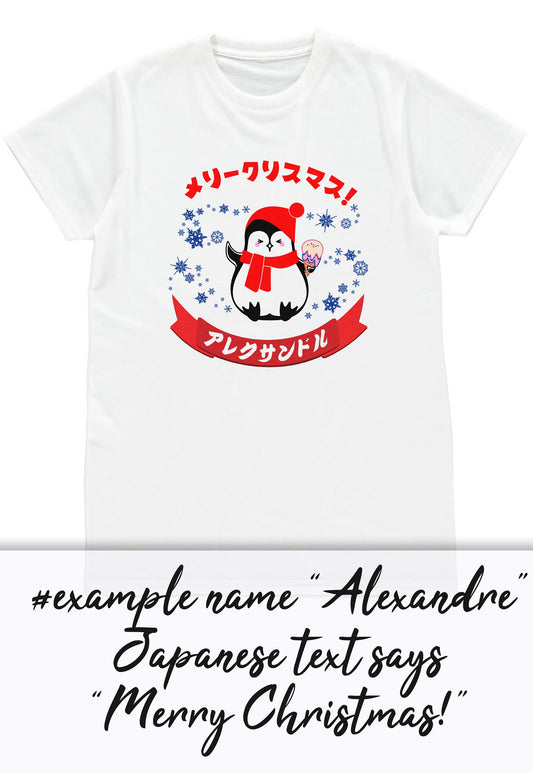 Custom Japanese T Shirt Kawaii Christmas Penguin Your Name Anime Manga Personalised Message Holiday Xmas Gift Cute Womens Girls Mens Tee Top