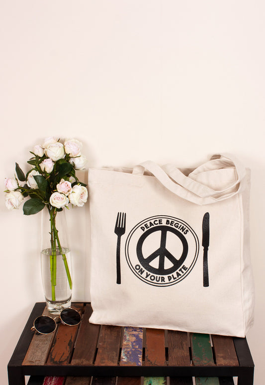 Vegan Tote Bag Peace Begins On Your Plate Egdy Veggie Peace Sign Cotton Canvas Tote Shopper Bag Screen Printed Eco Friendly Reusable Market