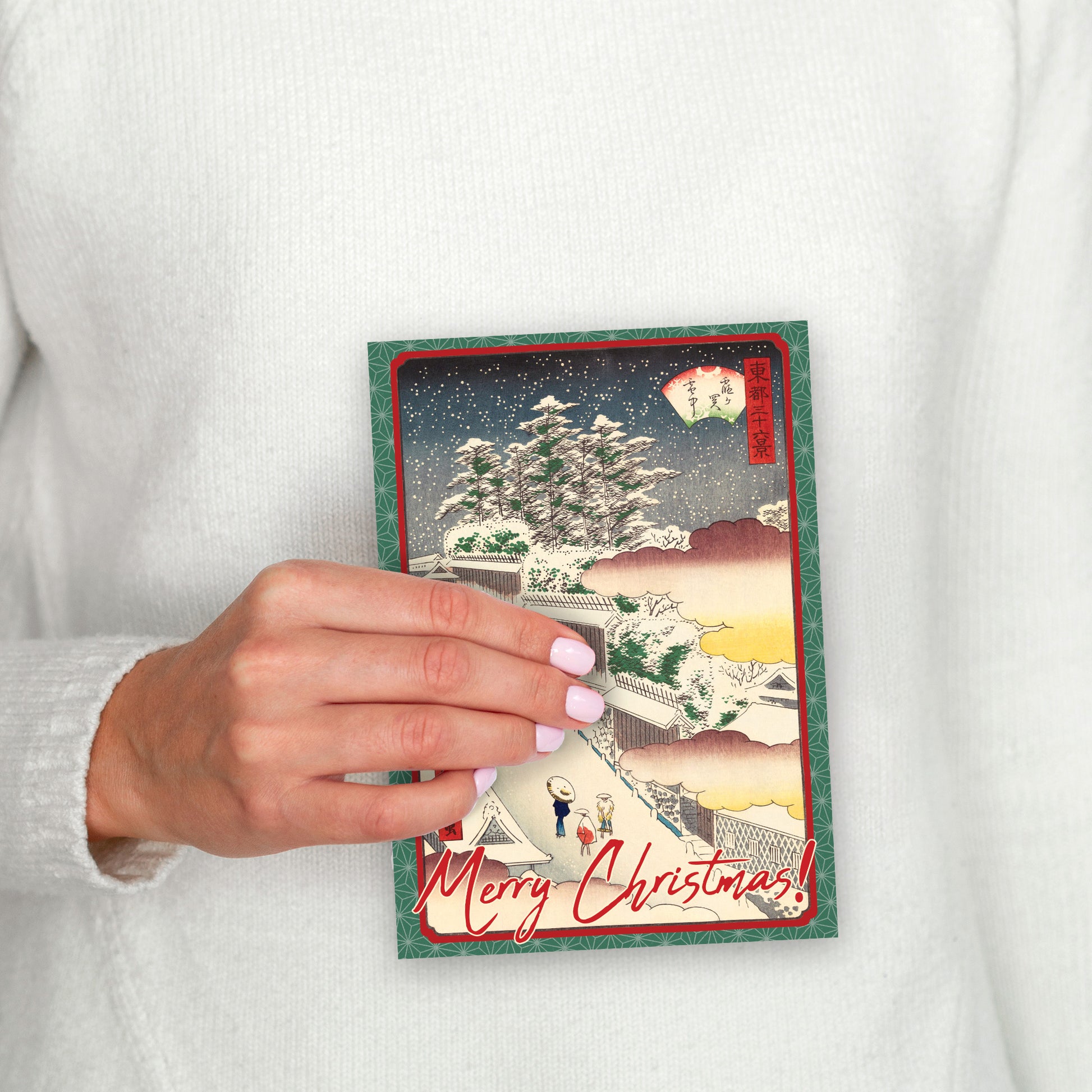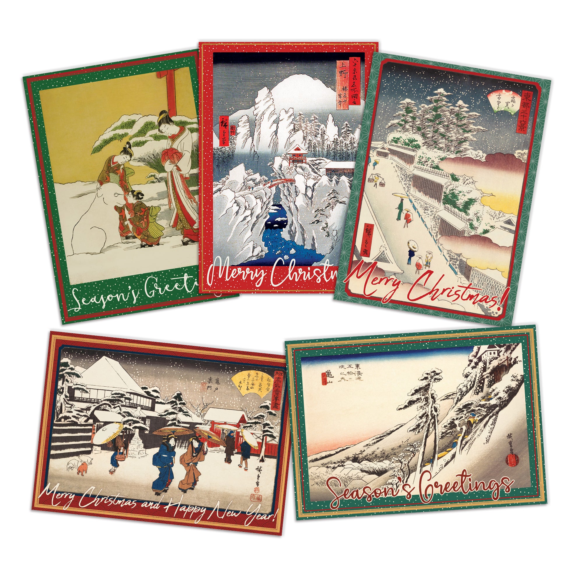 Japanese Ukiyo-e Art Christmas Greeting Cards – Set of 5 Large A5 Woodblock Print Cards with Festive Red Envelopes
