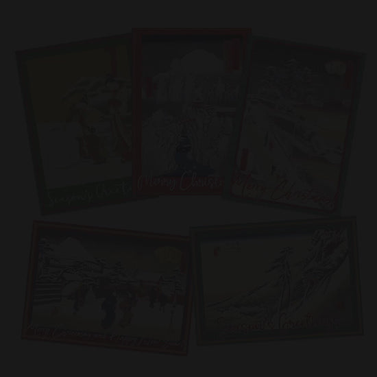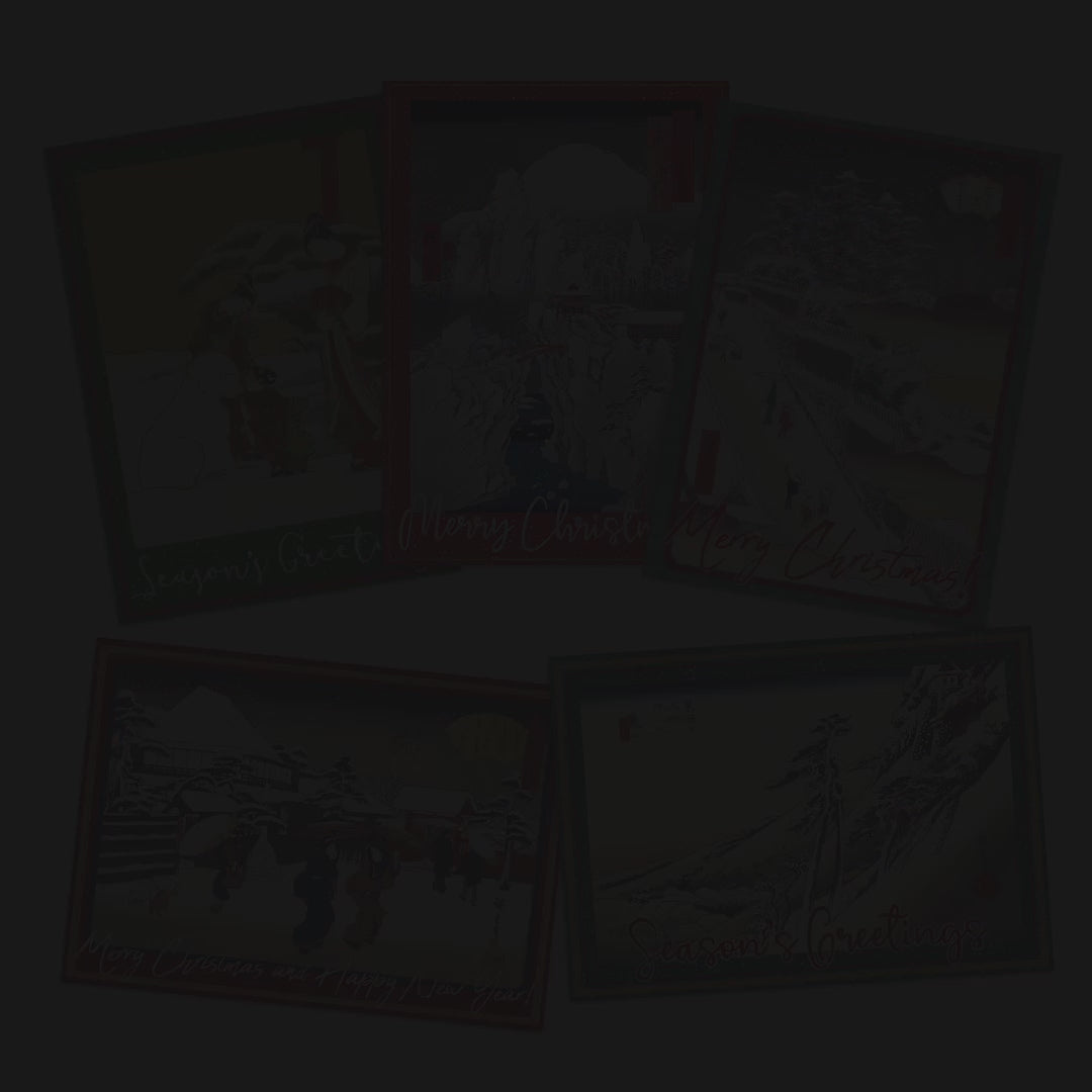Each card features a different artwork, carefully set within a festive red or softly patterned background that compliments the original print. Subtle traditional Japanese patterns and snow motifs create a harmonious winter atmosphere, perfect for the holiday season.